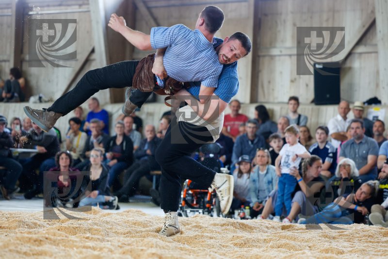 Beschreibung 20250412, Worblentaler Hallenschwinget, Wüthrich Jonas, Trub (l.) - Staudenmann Fabian, Guggisberg (r.)