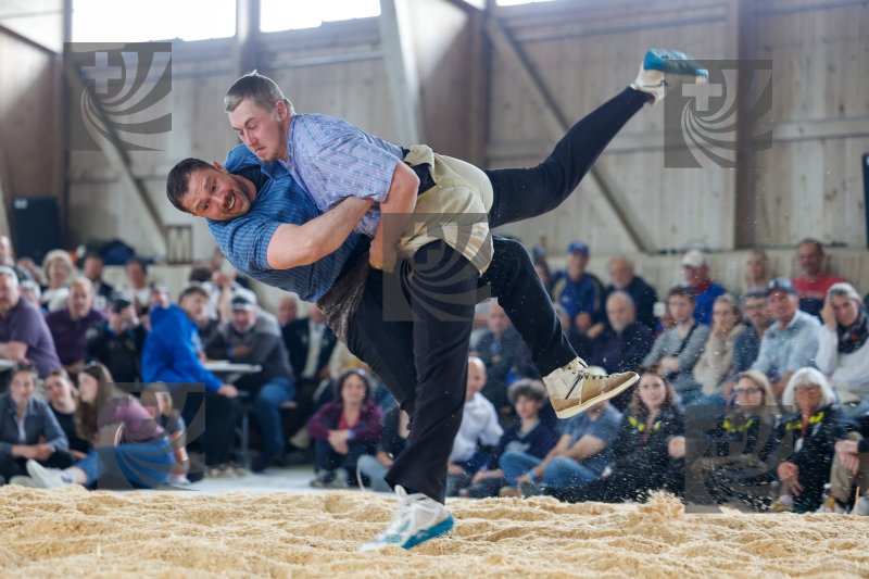 Beschreibung 20250412, Worblentaler Hallenschwinget, Staudenmann Fabian, Guggisberg (l.) - Appert Silvan, Ingenbohl (r.)